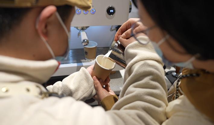 周偉琴(右)手把手教“唐寶”拉花