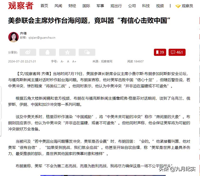 觀察者網2024-07-20報道:美參聯會主席炒作臺海問題,竟叫囂“有信心擊敗中國”