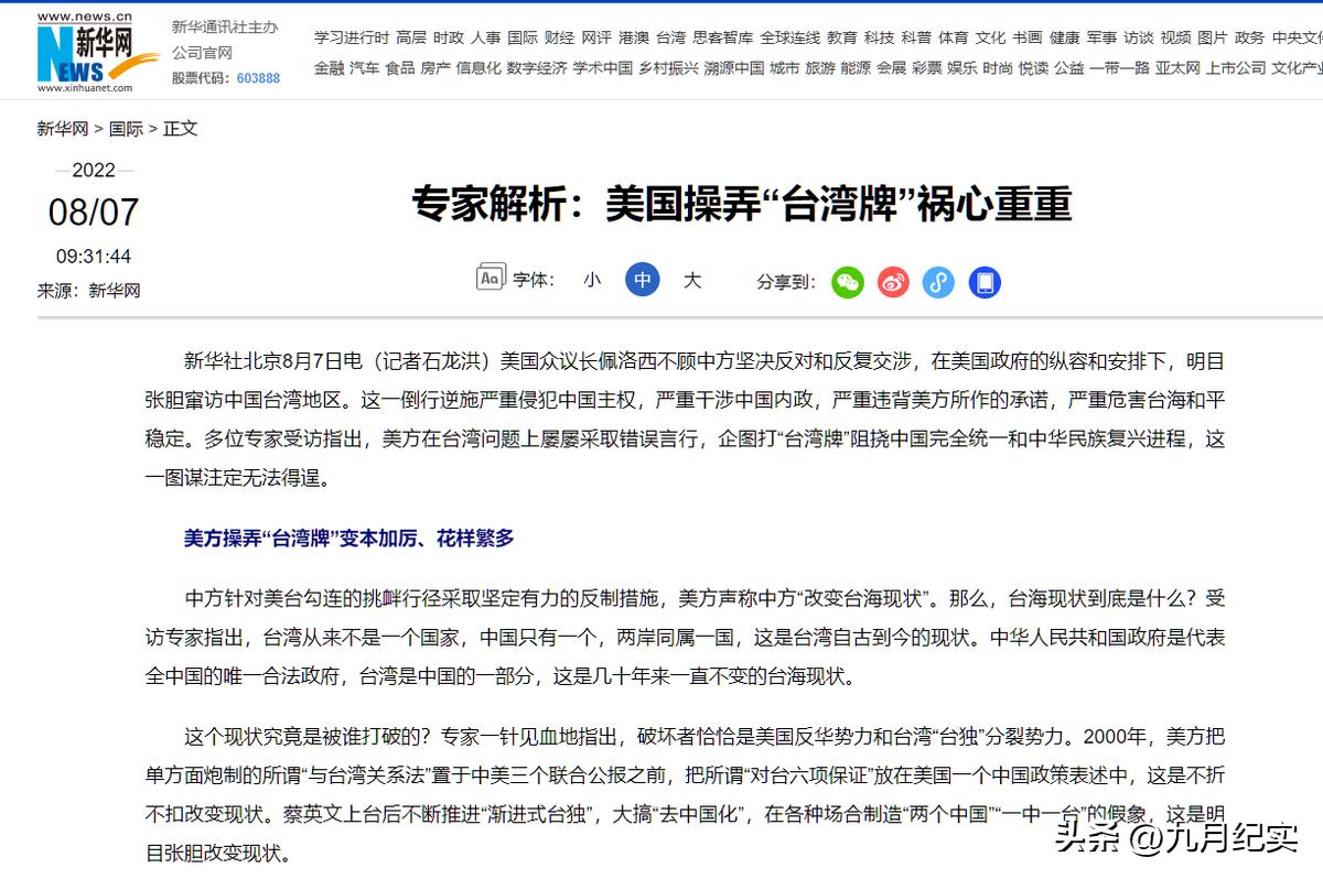 參考來源:新華網2022-08-07發佈:專家解析:美國操弄“臺灣牌”禍心重重