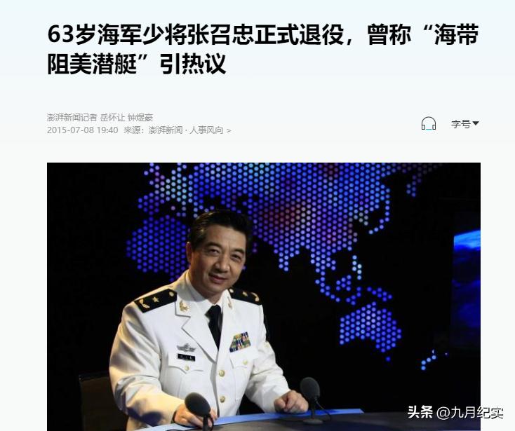 澎湃新聞2015-07-08報道:63歲海軍少將張召忠正式退役,曾稱“海帶阻美潛艇”引熱議