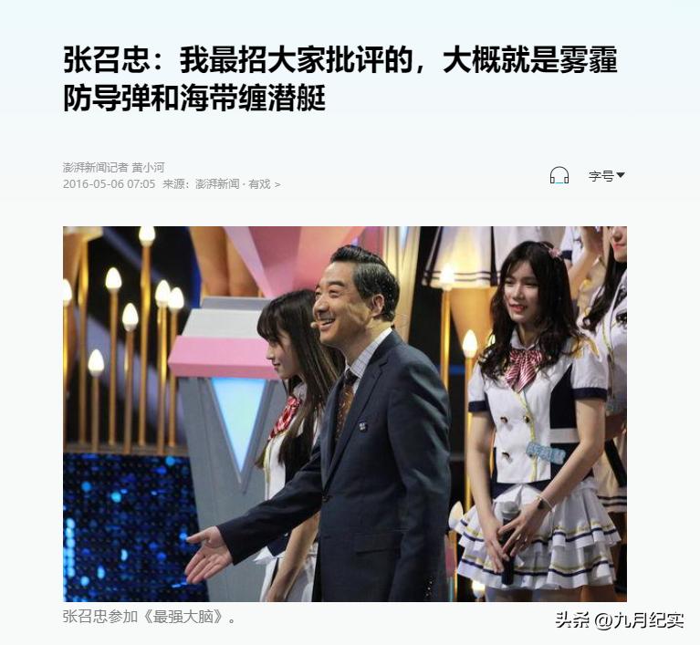澎湃新聞2016-05-06報道:張召忠:我最招大家批評的,大概就是霧霾防導彈和海帶纏潛艇