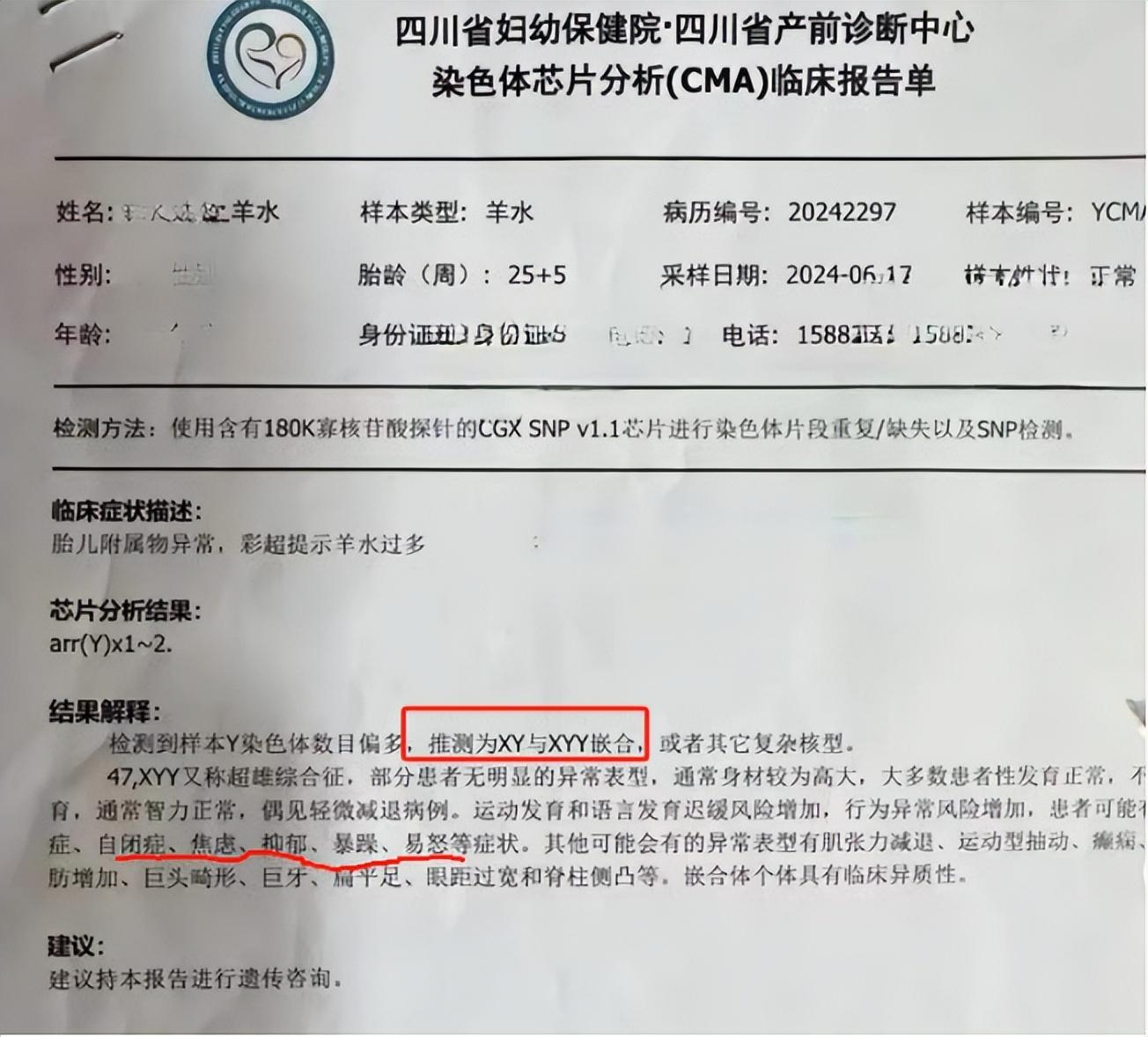 報告顯示,胎兒的Y染色體偏多,推測爲XY和XYY嵌合,這種病也稱爲“超雄體綜合徵”。