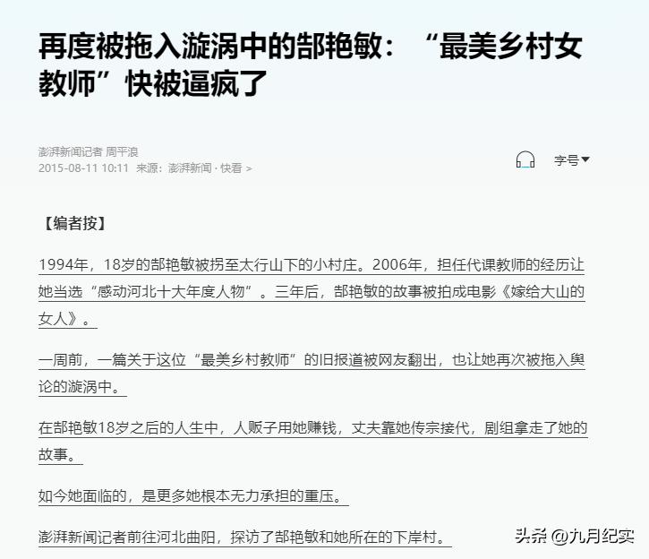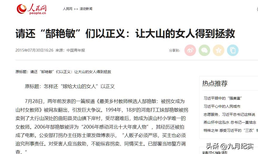 澎湃新聞2015-07-31報道:最美鄉村教師郜豔敏:公公救了我,被拐時我跪下求他買了我