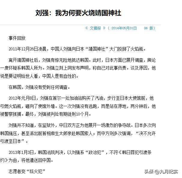 文摘報2014-05-31報道:劉強:我爲何要火燒靖國神社