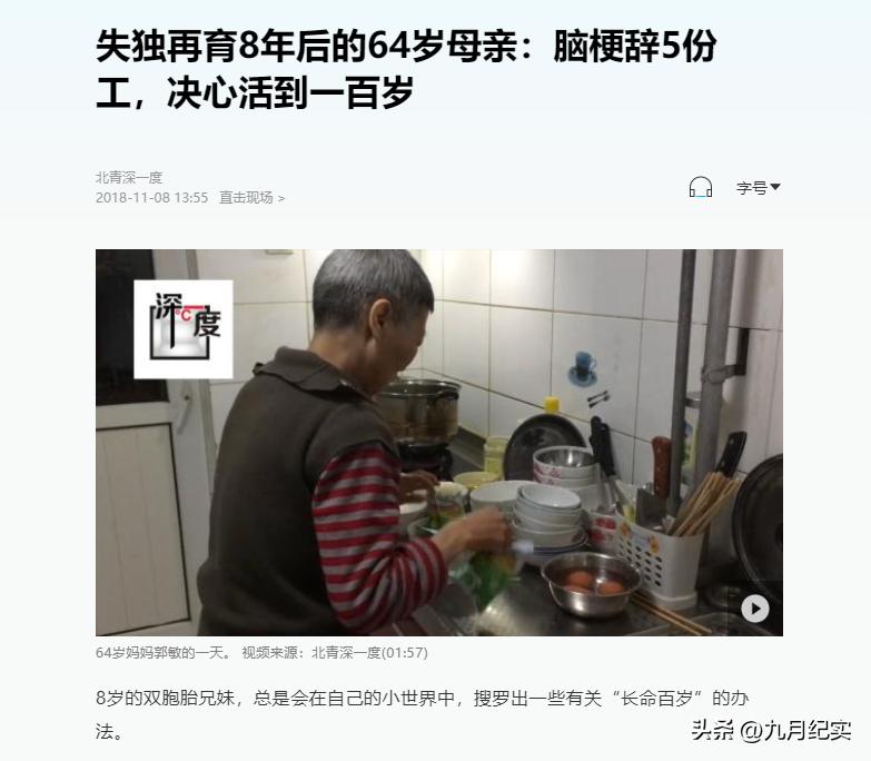 北青深一度2018-11-08報道:失獨再育8年後的64歲母親:腦梗辭5份工,決心活到一百歲