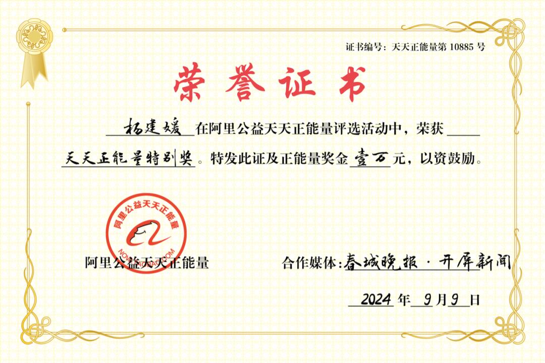 楊建媛收到來自阿里公益天天正能量聯合春城晚報-開屏新聞爲她頒發的正能量獎勵