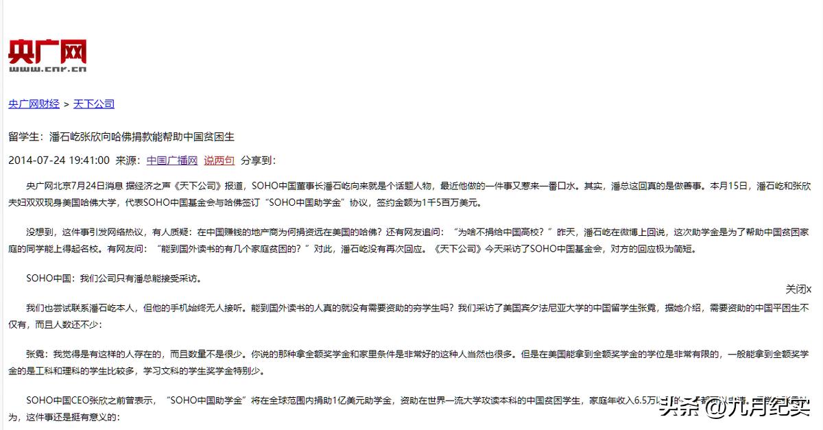 央廣網2014-07-24報道:留學生:潘石屹張欣向哈佛捐款能幫助中國貧困生