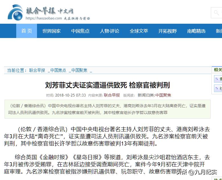聯合早報 2018-10-25報道:劉芳菲丈夫證實遭逼供致死 檢察官被判刑