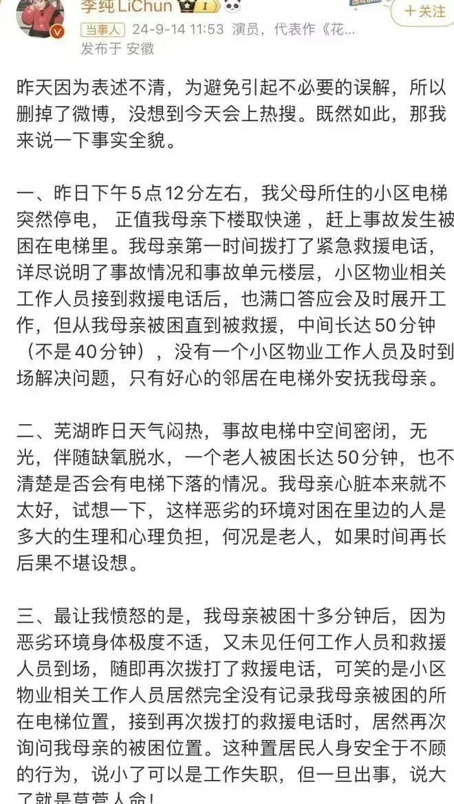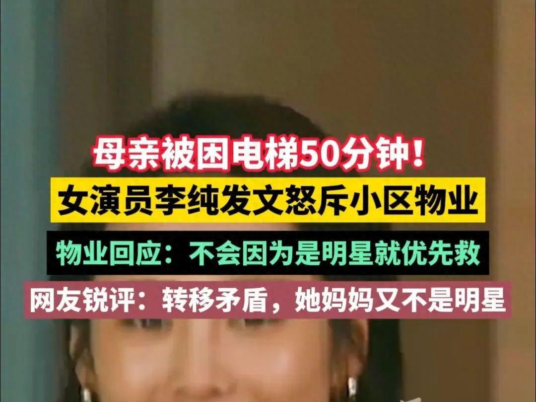 知名演員李純因母親被困電梯50分鐘,物業沒有及時救援,發文怒斥物業。