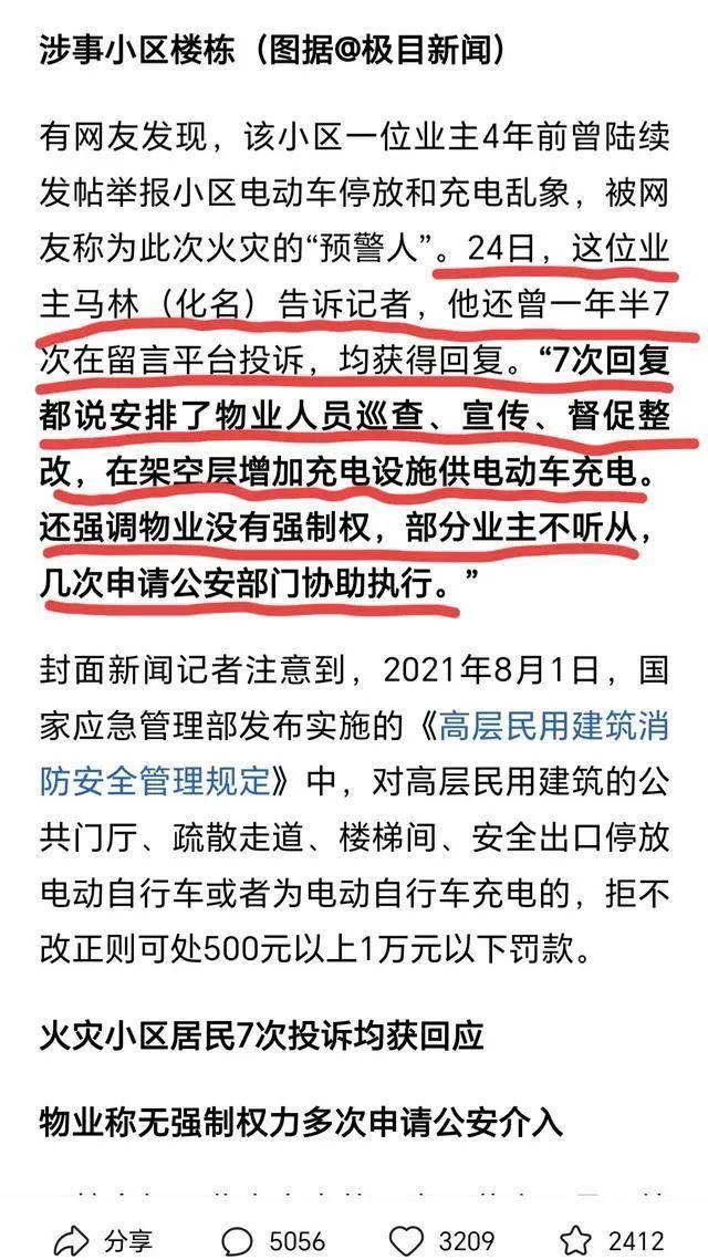 有網友在2021年就發文說物業不作爲,多次反饋有人推電動車上樓,隱患很大,但總是不了了之。