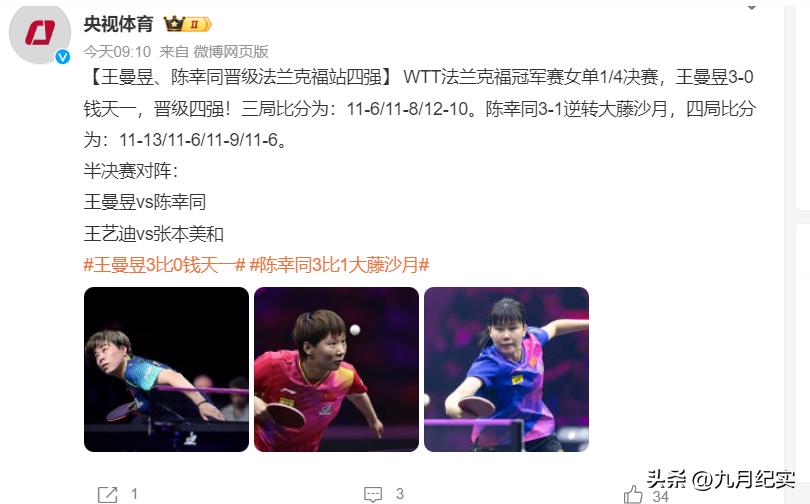 而四強席位,除了王藝迪和張本美和之外,另外兩個則是中國選手王曼昱和陳幸同。