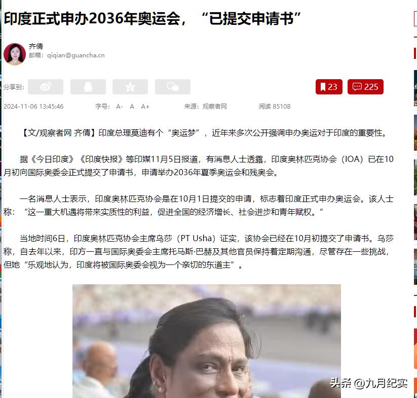 觀察者網2024-11-06報道:印度正式申辦2036年奧運會,“已提交申請書”