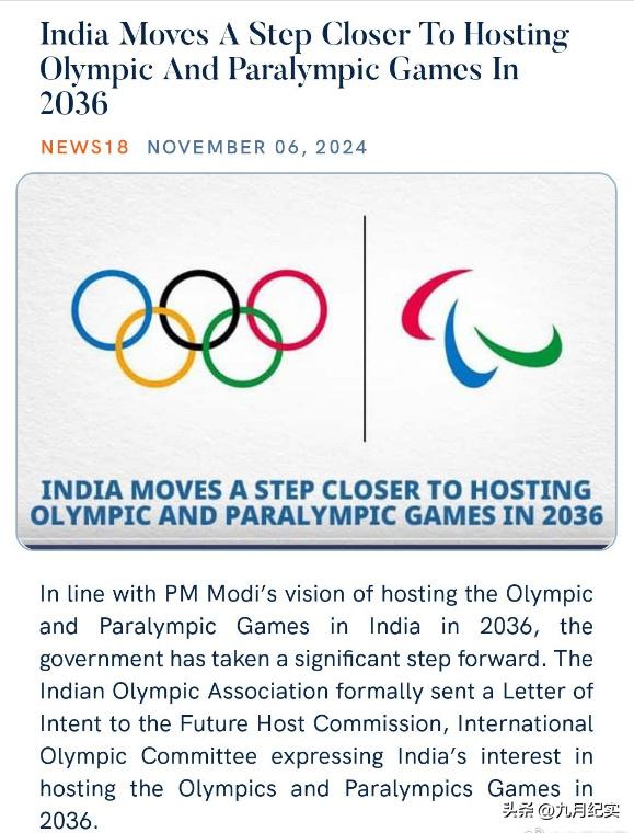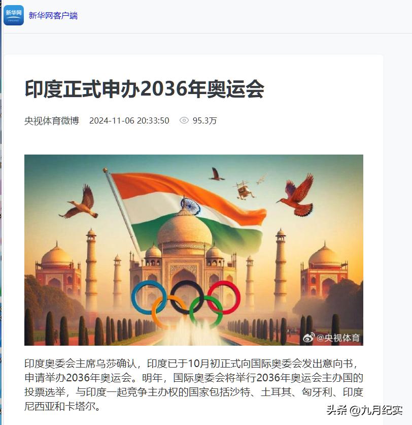 央視體育微博2024-11-06報道:印度正式申辦2036年奧運會