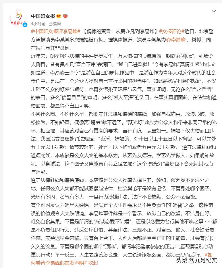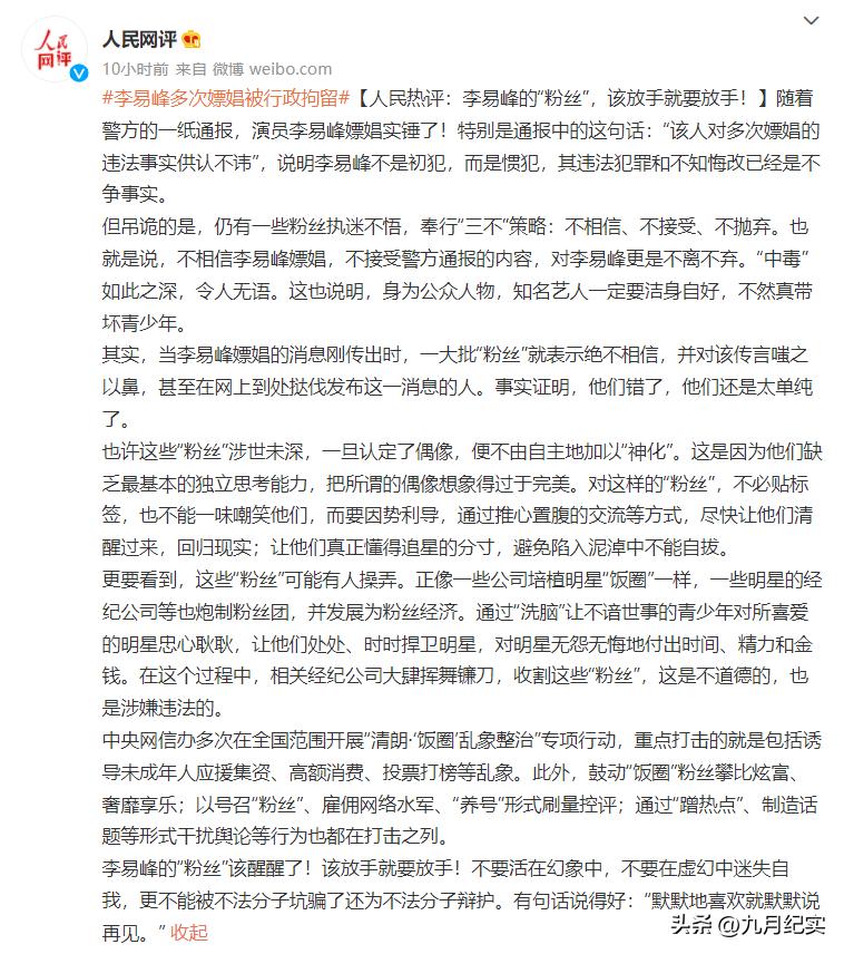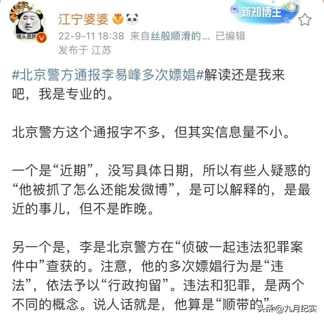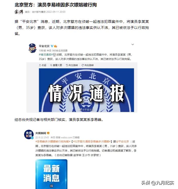 澎湃新聞2022-09-11報道:北京警方:演員李易峯因多次嫖娼被行拘