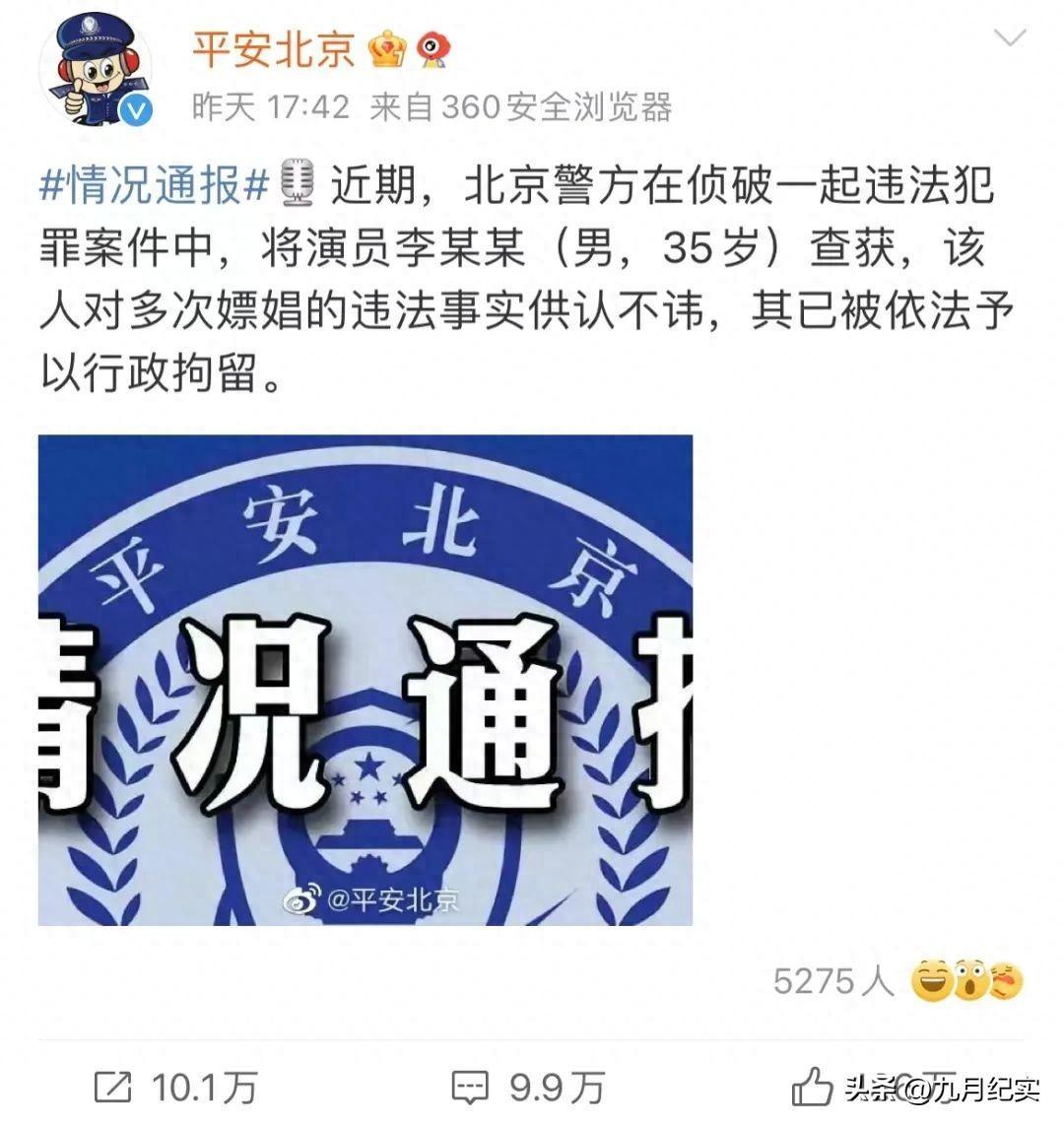 “北京警方在偵破一起違法犯罪案件中,將演員李某某(男,35歲)查獲,該人對多次嫖娼的違法事實供認不諱”