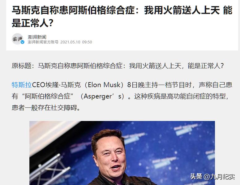 澎湃新聞2021-05-10報道:馬斯克自稱患阿斯伯格綜合症:我用火箭送人上天 能是正常人?
