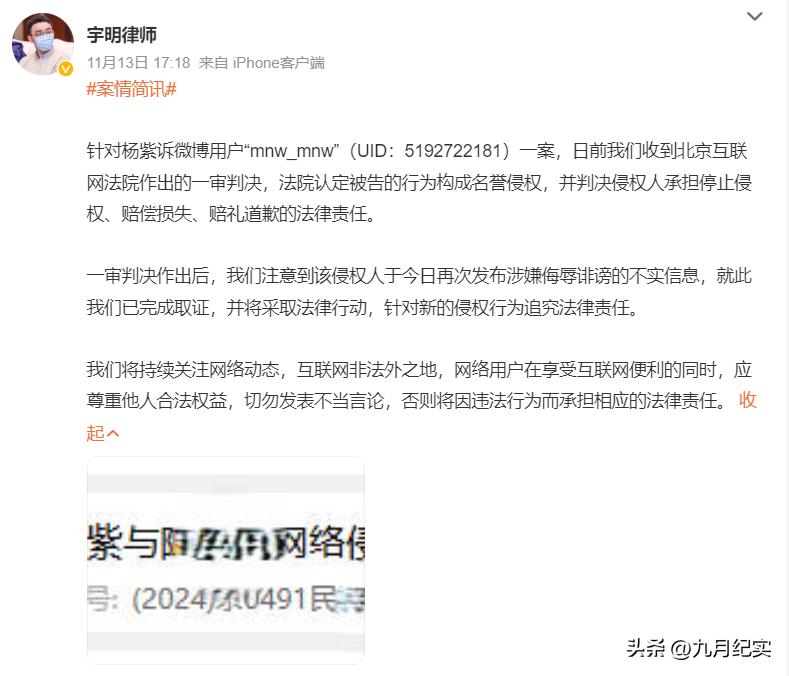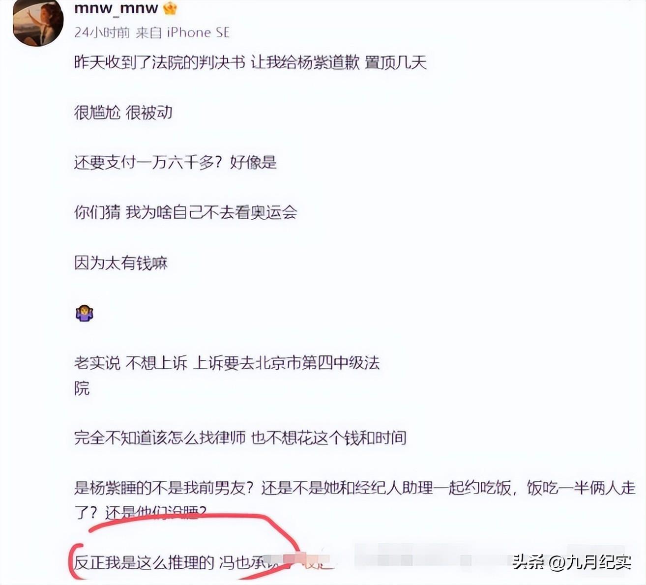 巴黎奧運會前後,她曾經發文稱自己收到了法院的判決書,她要給楊紫道歉,並且會將這個博文置頂。