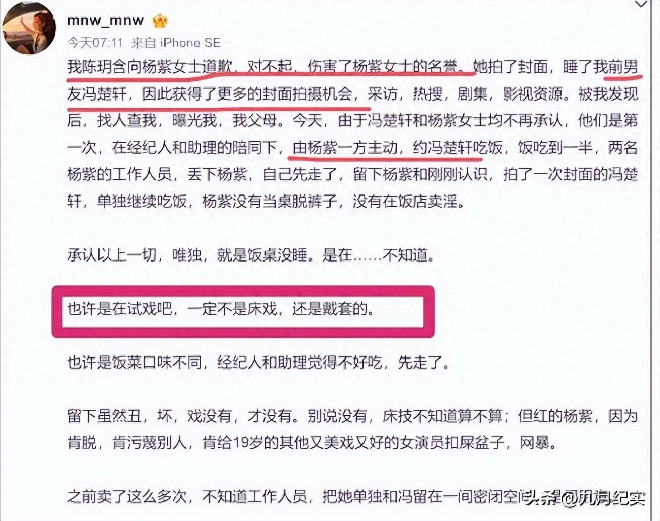 一位名爲“@mnw_mnw”的用戶在社交平臺上自稱是馮楚軒的前女友,直言楊紫和馮楚軒有不正當關係。