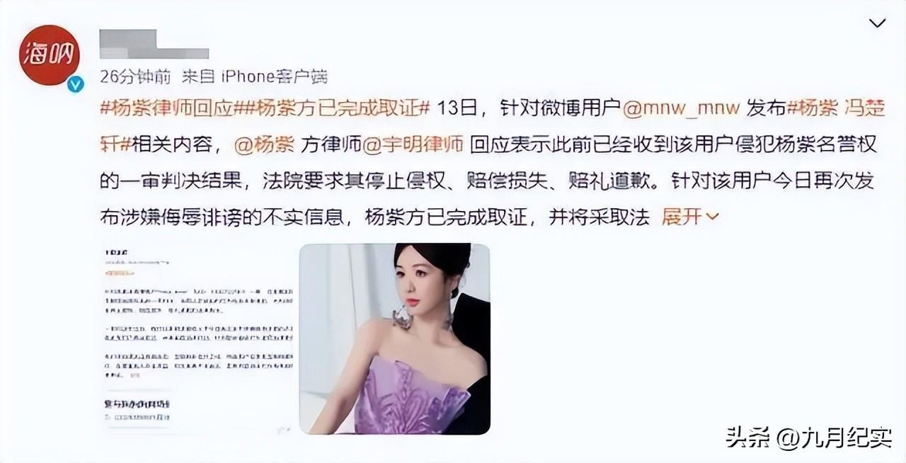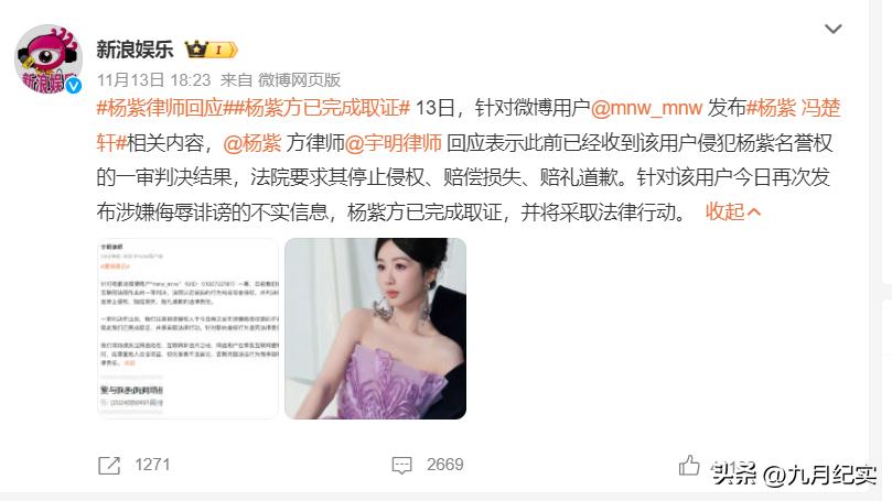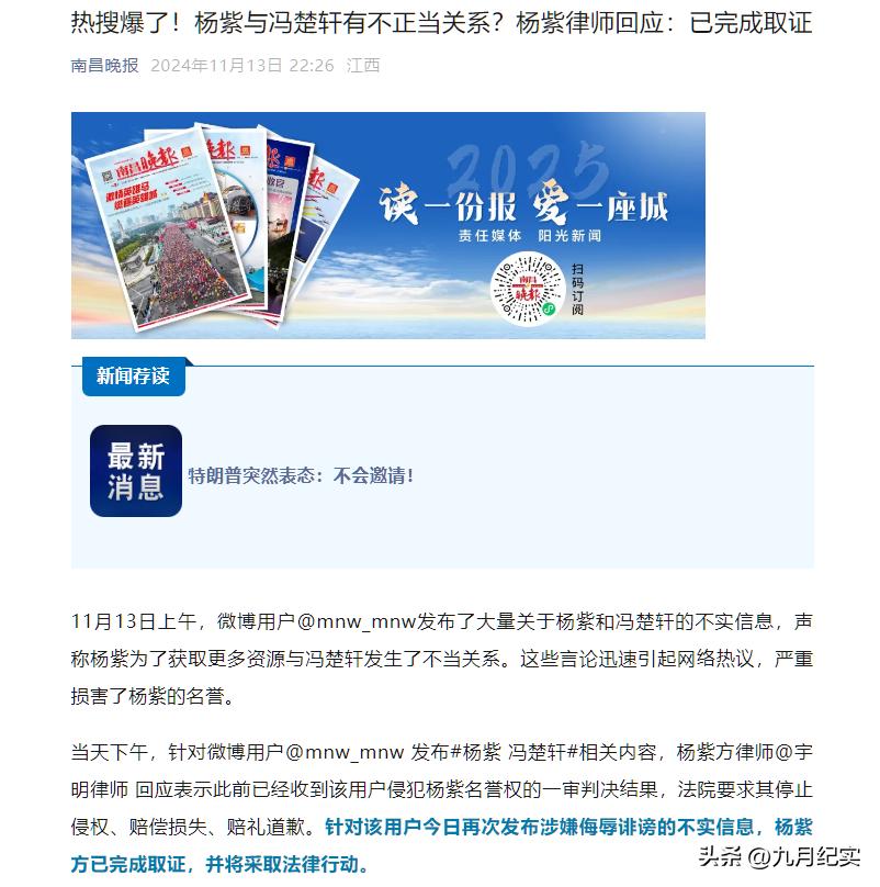 南昌晚報2024-11-13報道:熱搜爆了!楊紫與馮楚軒有不正當關係?楊紫律師回應:已完成取證