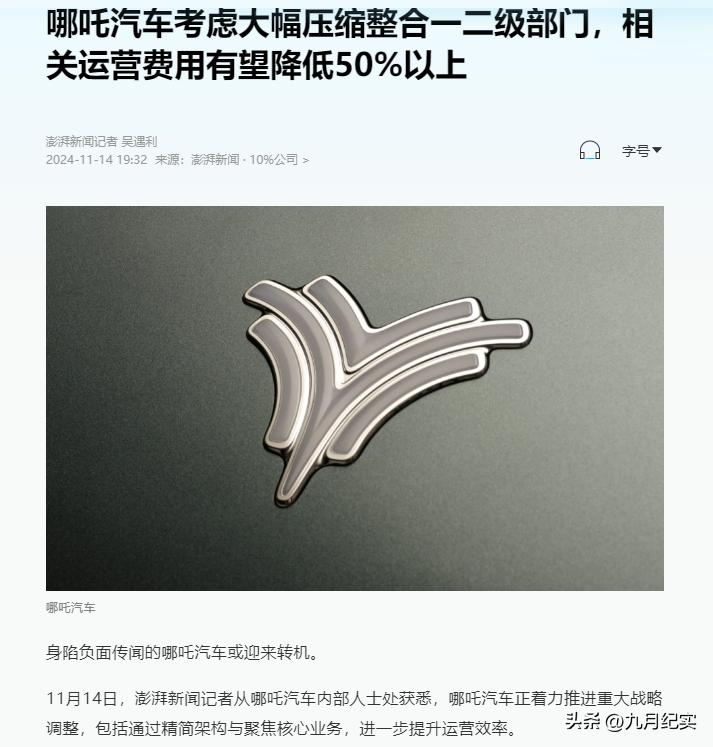 澎湃新聞2024-11-14報道:哪吒汽車考慮大幅壓縮整合一二級部門,相關運營費用有望降低50%以上