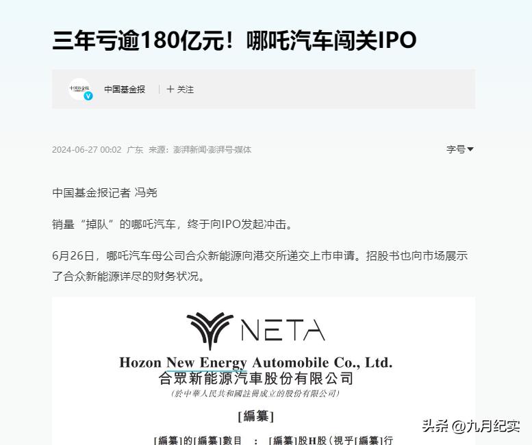 中國基金報2024-06-27報道:三年虧逾180億元!哪吒汽車闖關IPO