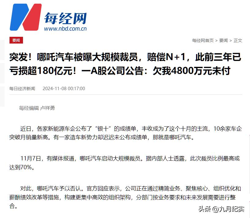 每日經濟新聞2024-11-08報道:突發!哪吒汽車被曝大規模裁員,賠償N+1,此前三年已虧損超180億元!一A股公司公告:欠我4800萬元未付