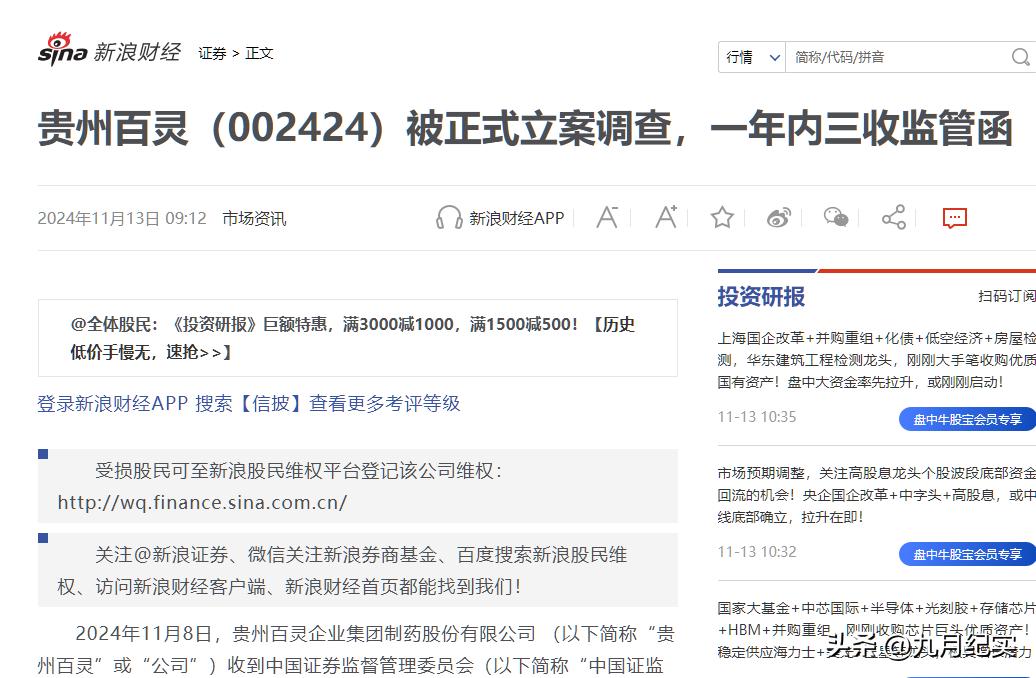 新浪財經2024-11-13報道:貴州百靈(002424)被正式立案調查,一年內三收監管函
