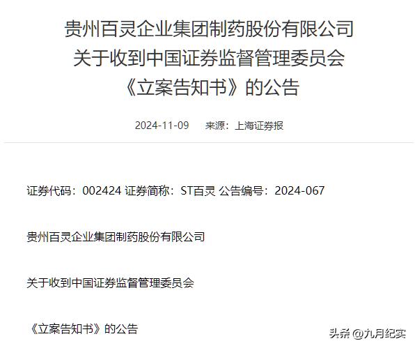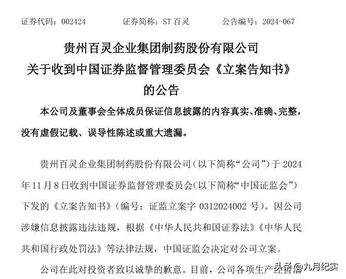 2024年11月8日,貴州百靈企業集團製藥股份有限公司收到了來自中國證券監督管理委員會發布的《立案告知書》。