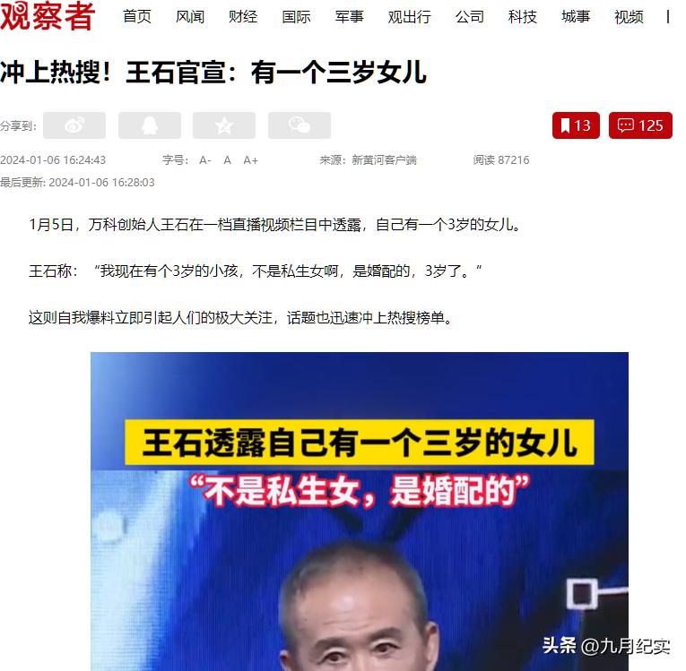 觀察者網2024-01-06報道:衝上熱搜!王石官宣:有一個三歲女兒