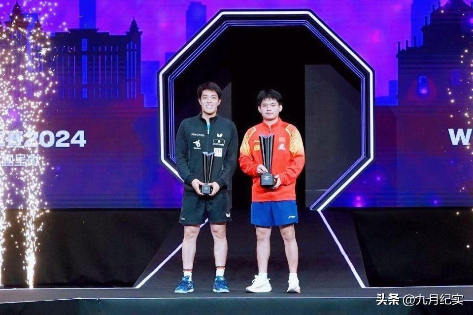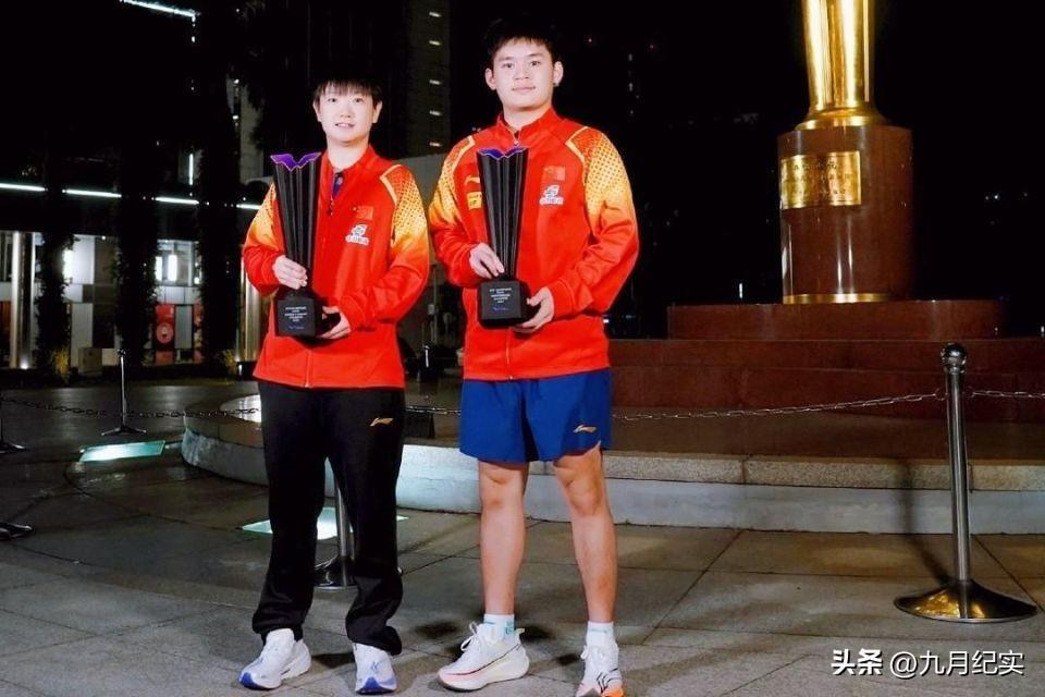 中國乒乓球運動員孫穎莎與林詩棟,獲得澳門冠軍賽冠軍合影