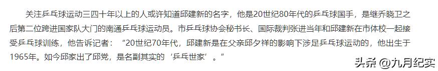 出生於江蘇南通的邱建新,在父親的影響下開始學習打乒乓球,如今,他們家幾乎已經成爲了乒乓球世家。