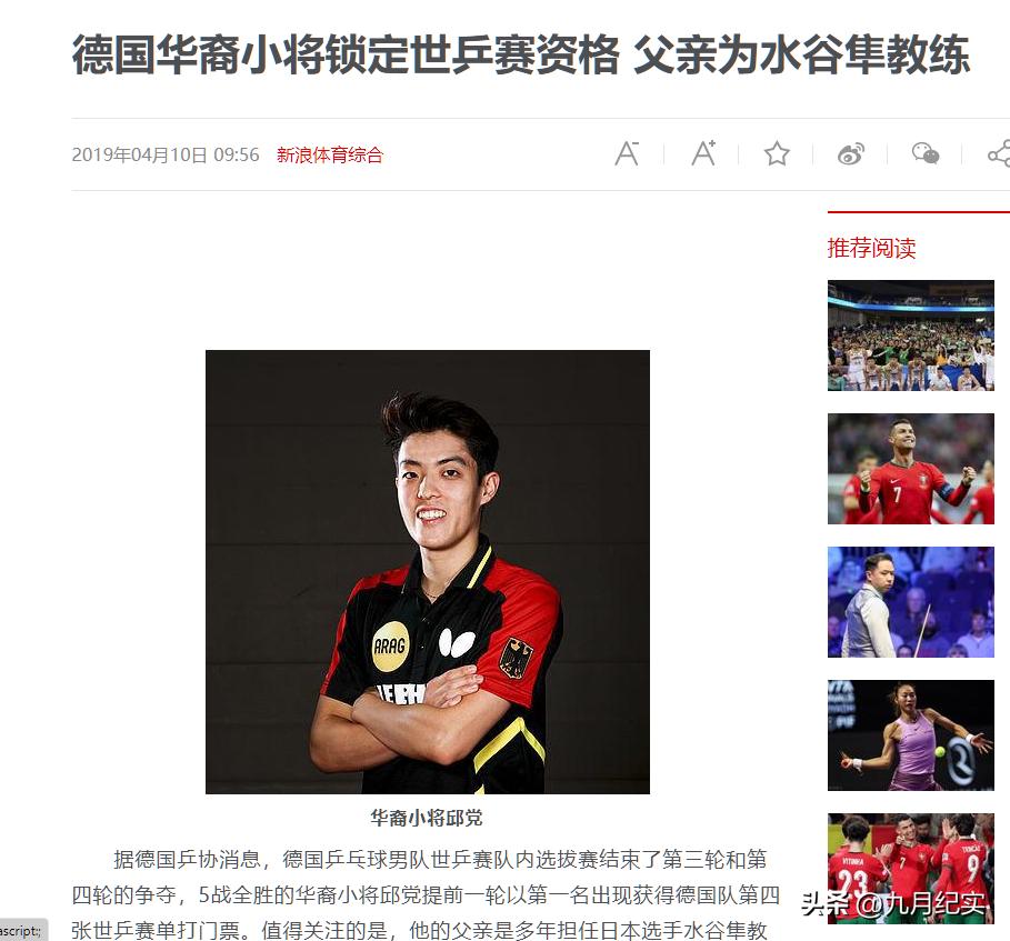新浪體育綜合2019-04-10報道:德國華裔小將鎖定世乒賽資格 父親爲水谷隼教練