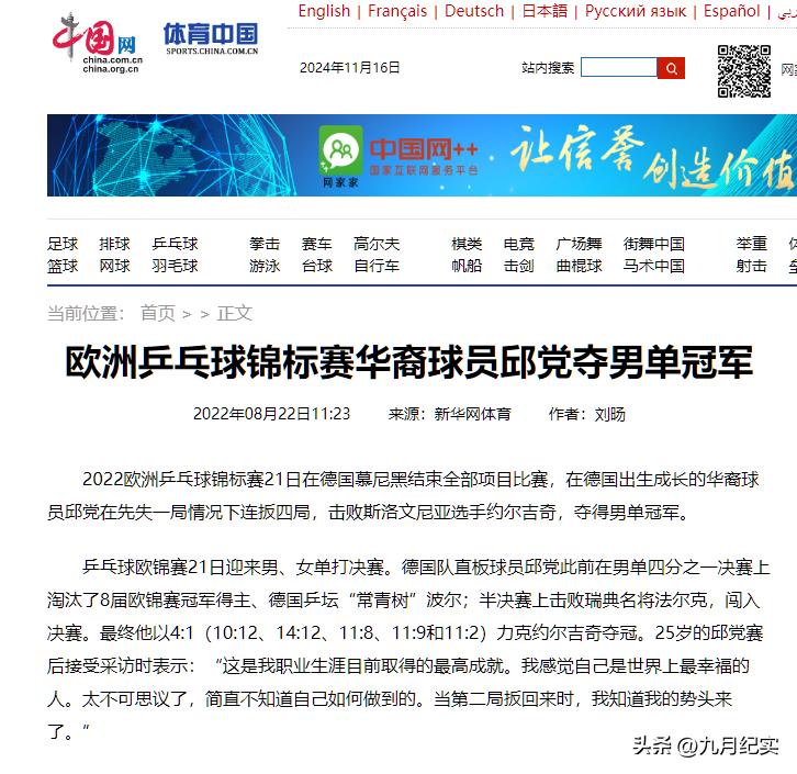 新華網體育 2022-08-22報道:歐洲乒乓球錦標賽華裔球員邱黨奪男單冠軍