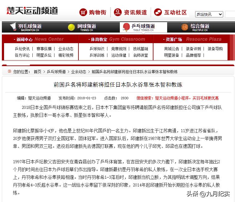 楚天運動頻道2018-01-23報道:前國乒名將邱建新將擔任日本隊水谷隼張本智和教練