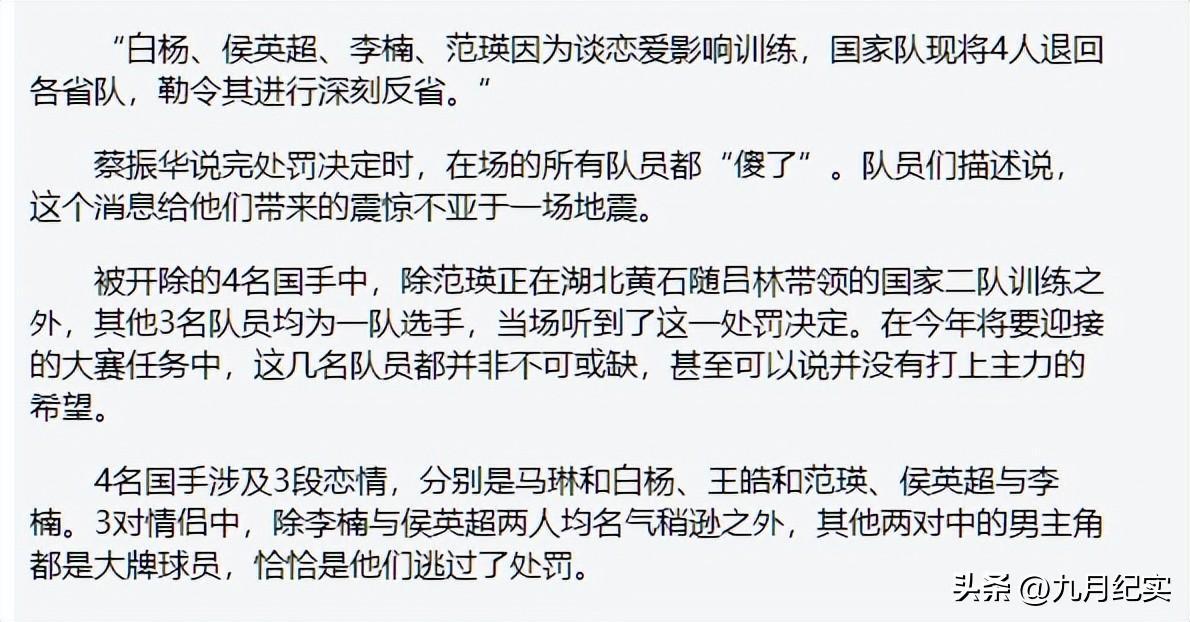 2004年新年的第2天,國家隊就發佈公告,將範瑛、侯英超、白楊、李楠四人退回各省隊進行反省。