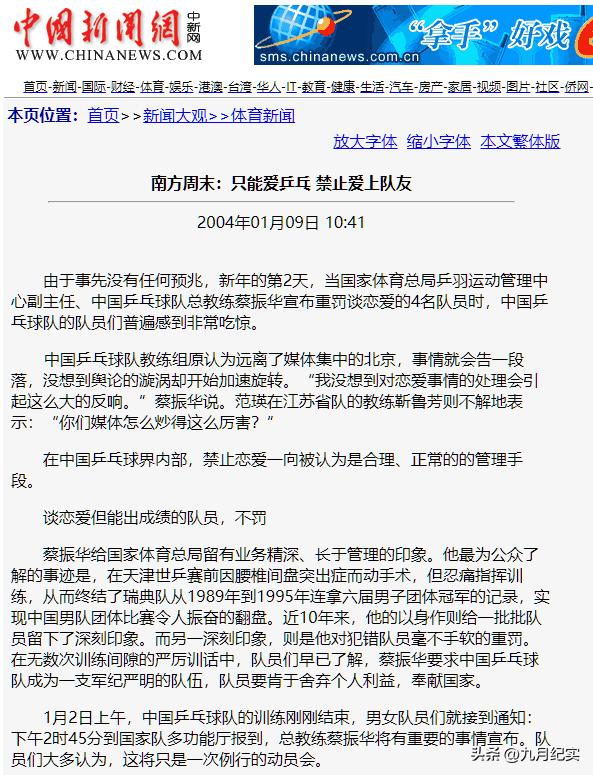 參考來源中國新聞網2004-01-09報道:南方週末:只能愛乒乓 禁止愛上隊友