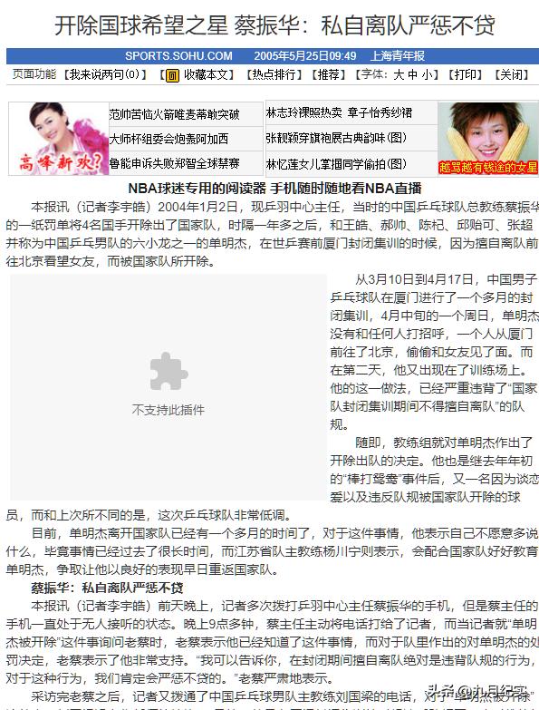 上海青年報2005-05-25報道:開除國球希望之星 蔡振華:私自離隊嚴懲不貸