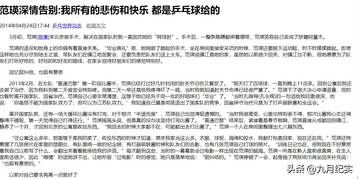 參考來源乒乓世界雜誌2014-04-24報道:範瑛深情告別:我所有的悲傷和快樂,都是乒乓球給的