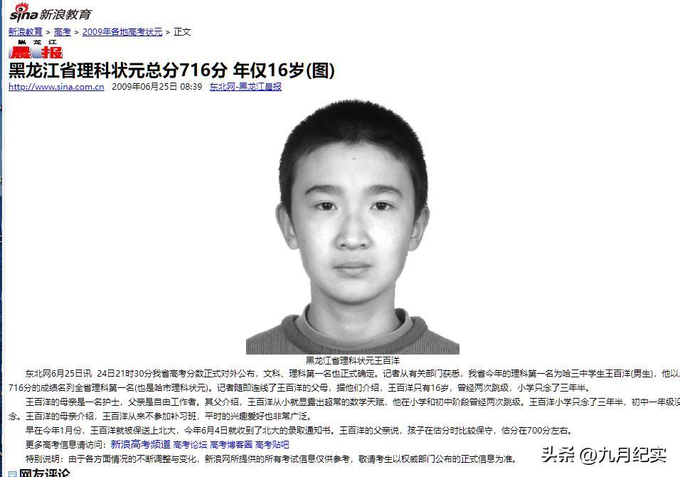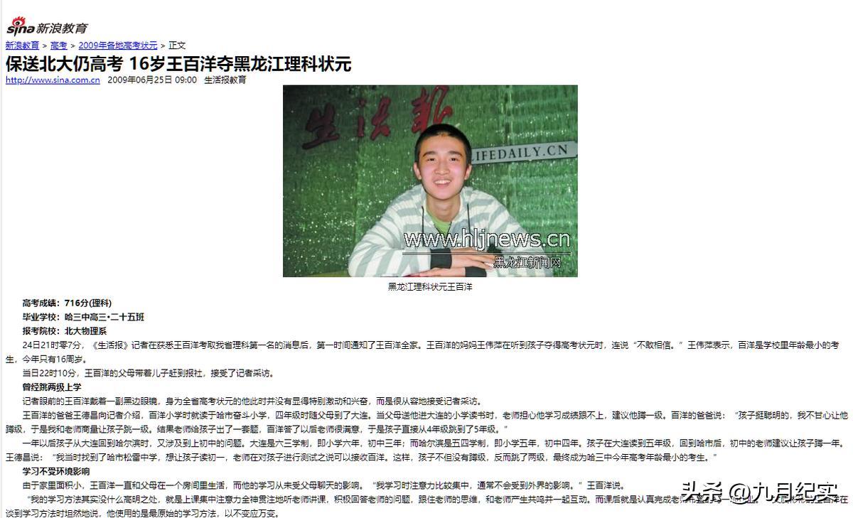 生活教育2009年06月25日報道:保送北大仍高考 16歲王百洋奪黑龍江理科狀元