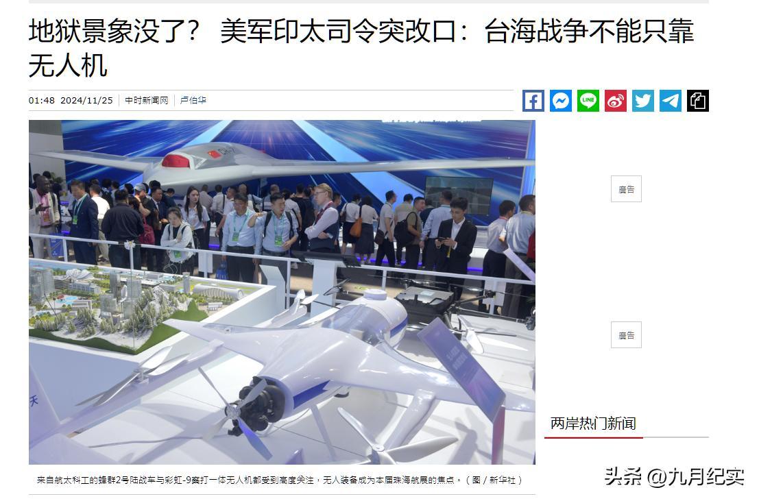 中時新聞網2024-11-25報道:地獄景象沒了? 美軍印太司令突改口:臺海戰爭不能只靠無人機