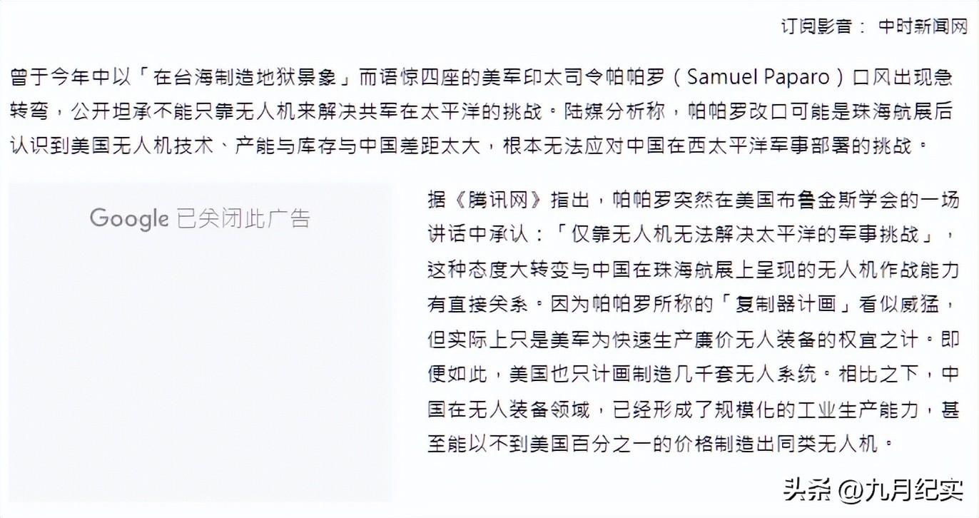 對於他的變化, 相關媒體表示,很大程度上是因爲珠海航展讓帕帕羅意識到了美國在無人機的技術以及庫存等方面和中國存在巨大的差距。