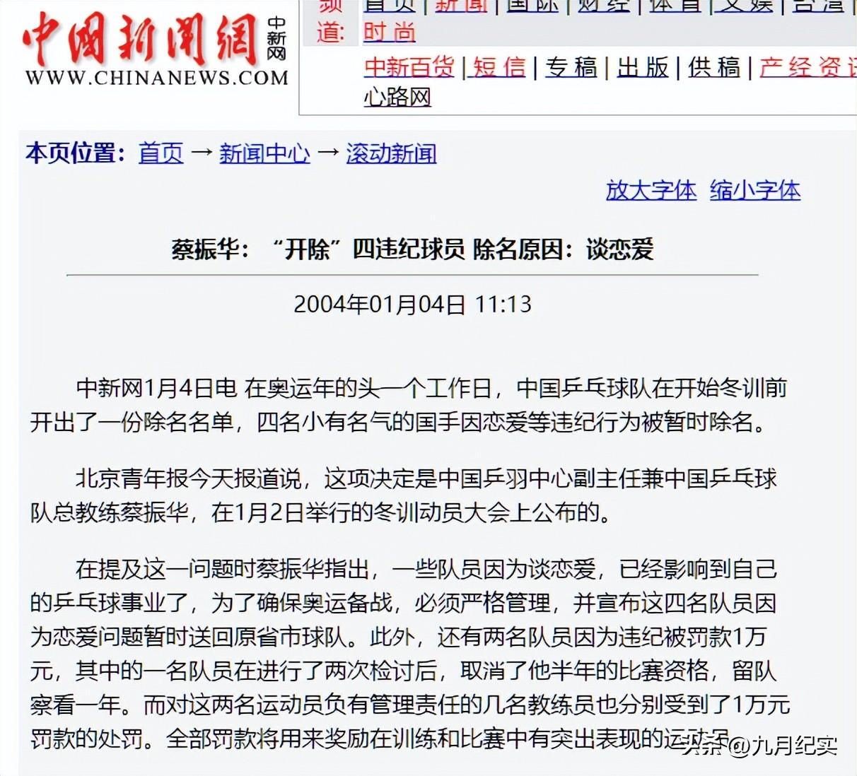 而最大的原因,就是2004年國乒突然發佈一則公告,在公告中四名運動員因爲談戀愛被國加隊開除,退回省隊。