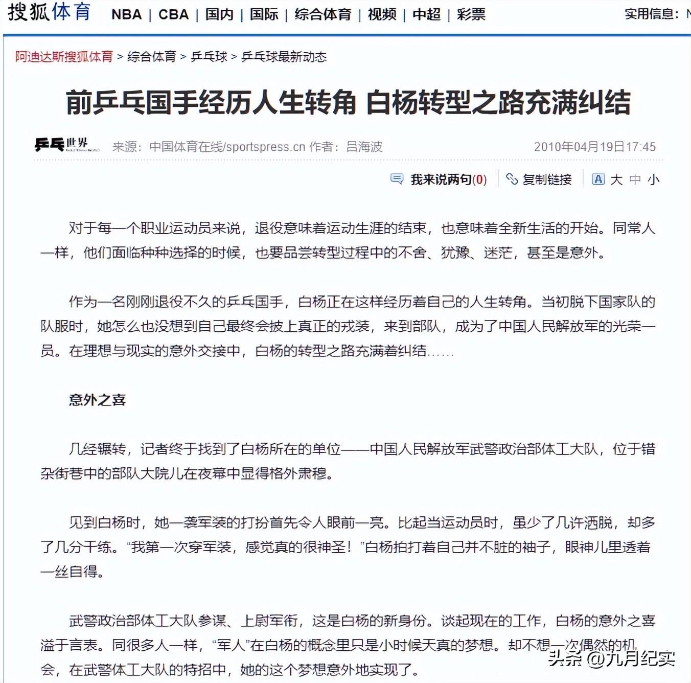 中國體育在線2010-04-19報道:前乒乓國手經歷人生轉角 白楊轉型之路充滿糾結