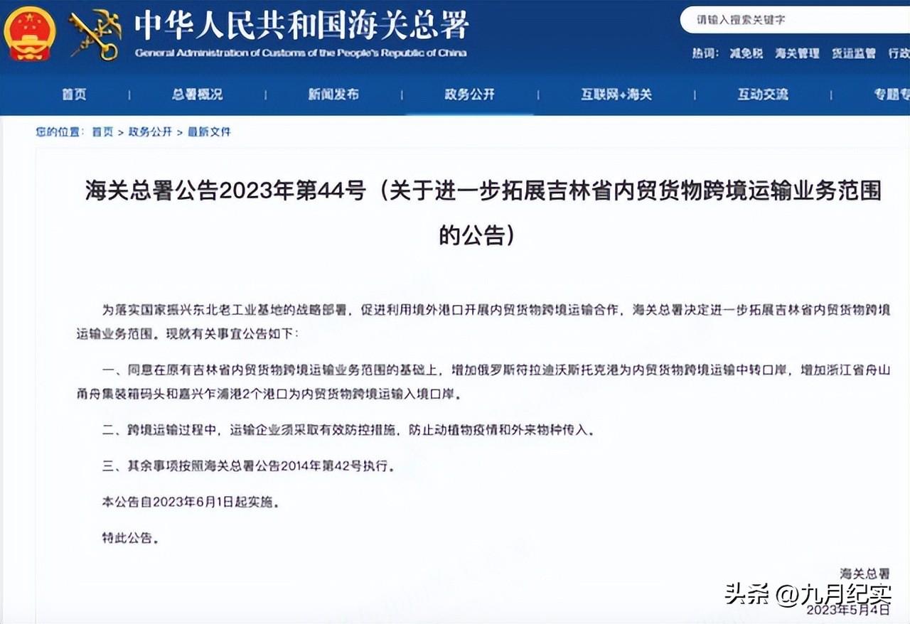 中華人民共和國海關總署2023年5月4日報道:海關總署公告2023年第44號(關於進一步拓展吉林省內貿貨物跨境運輸業務範圍的公告)