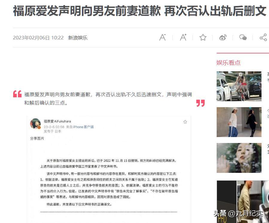 新浪娛樂 2023-02-06報道:福原愛發聲明向男友前妻道歉 再次否認出軌後刪文