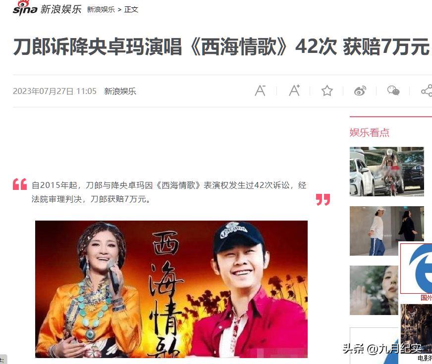 新浪娛樂2023年07月27日報道 :刀郎訴降央卓瑪演唱《西海情歌》42次 獲賠7萬元