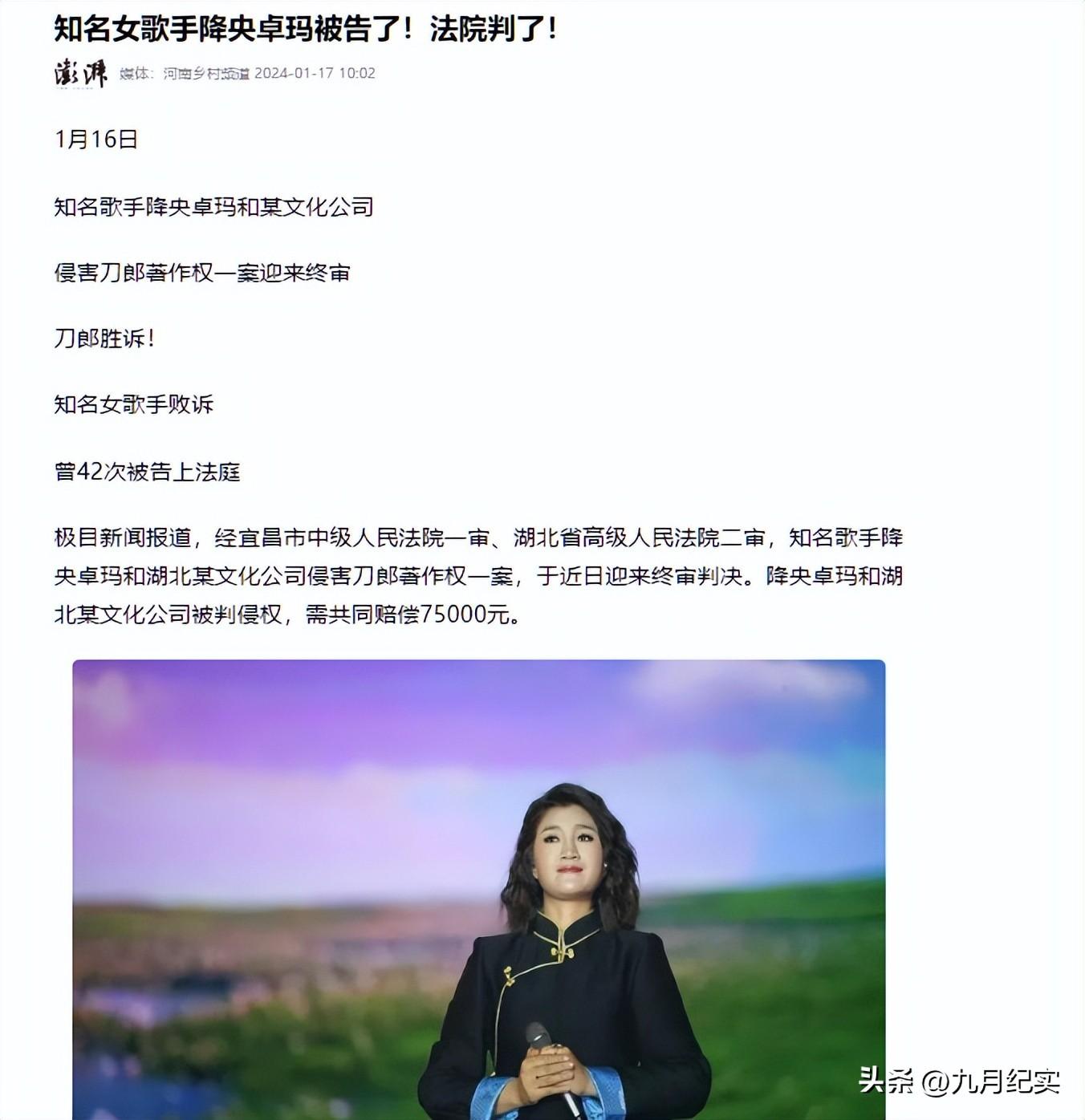 澎湃新聞2024-01-17報道:知名女歌手降央卓瑪被告,法院判了
