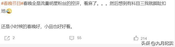 更有人吐槽,現在的語言類節目也都很無聊,很多笑點都是網絡上的爛梗,幾乎是“春晚有什麼,就看網上流行什麼”,而以前卻是“今年流行什麼就看春晚放什麼”。