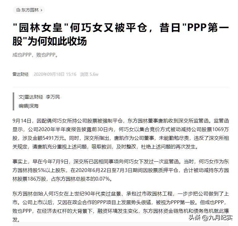 雷達財經 2020年09月18日報道:"園林女皇"何巧女又被平倉,昔日"PPP第一股"爲何如此收場