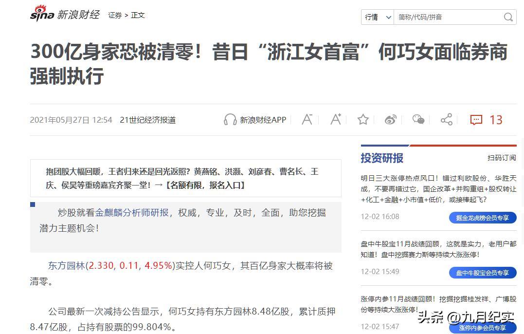 21世紀經濟報道2021年05月27日報道:300億身家恐被清零!昔日“浙江女首富”何巧女面臨券商強制執行